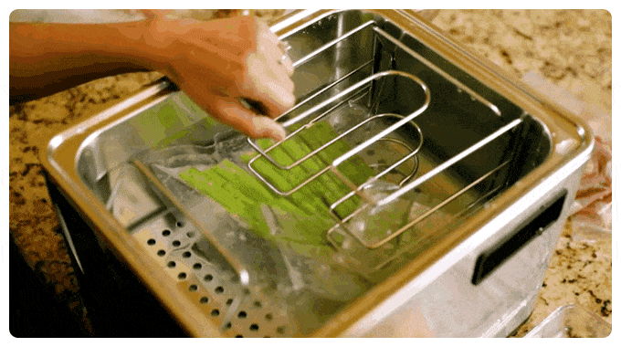 Drop the sealed pouches into the preheated water oven to cook. The water oven does the work. Just set and walk away.
